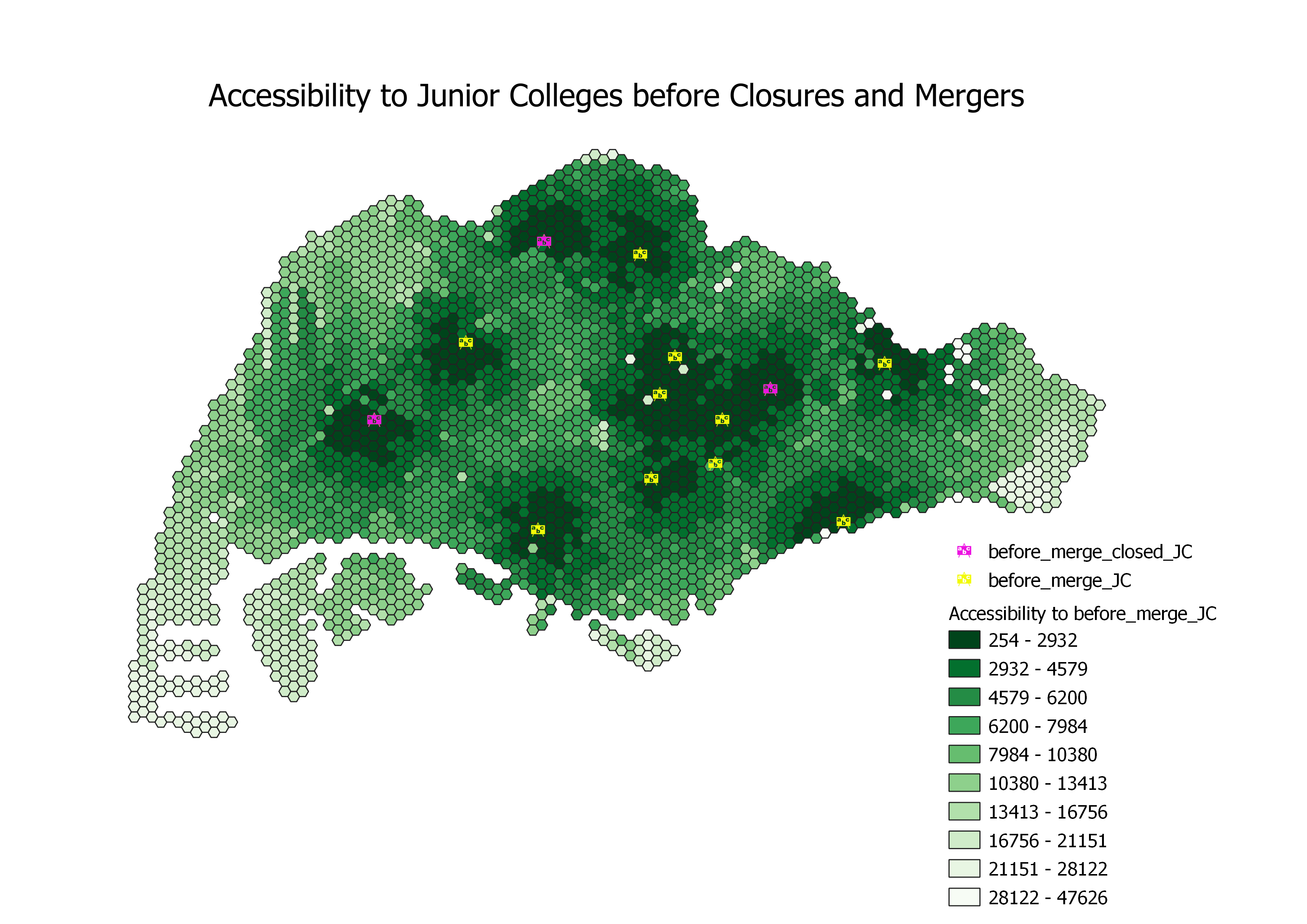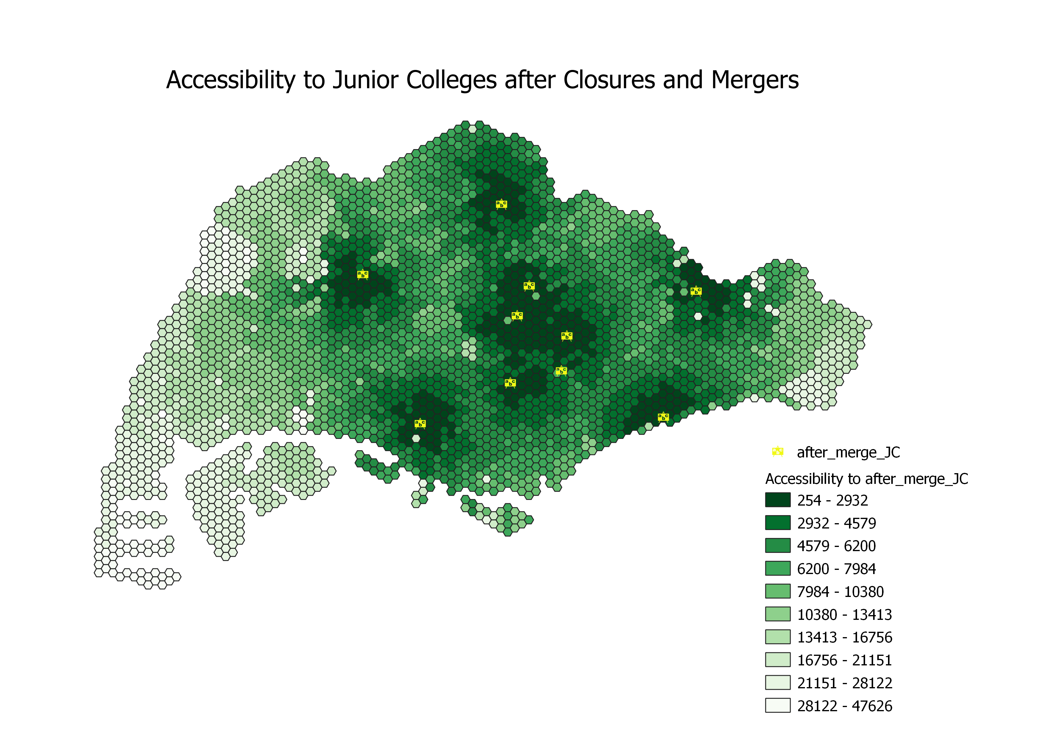Areas with higher accessibility will have hexagons with darker shades of green and lower distance (in metres) to reach JCs as compared to those with lower accessibility. These areas are located close to the central region of Singapore due to a group of JCs located close to one another; these JCs include Raffles Institution, Nanyang Junior College, Anderson Serangoon Junior College, Eunoia Junior College and St Andrew's Junior College. Hence, residents living in Bishan, Toa Payoh and Ang Mo Kio experience higher accessibility to junior college education in Singapore as they live either near or in between these JCs.
