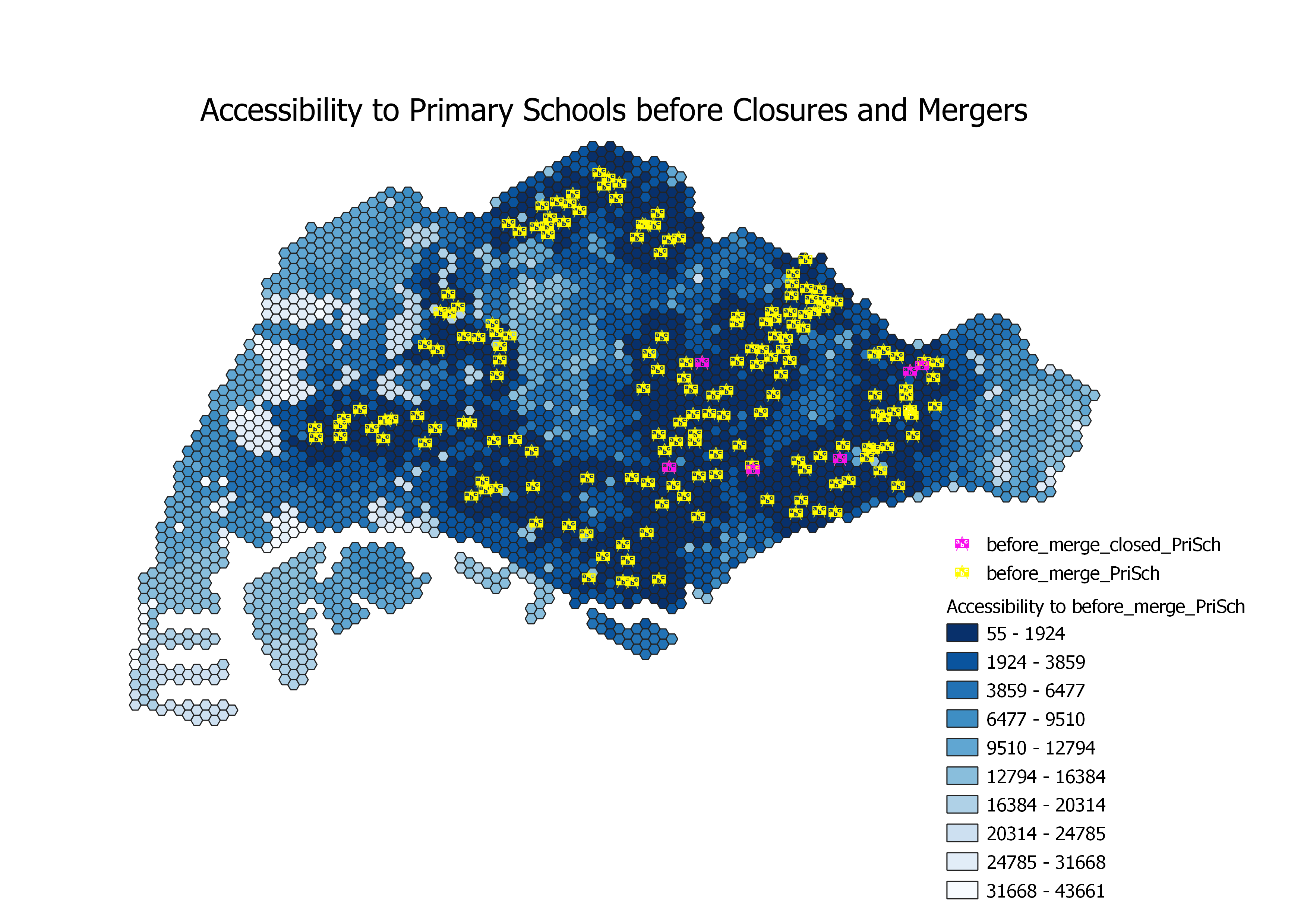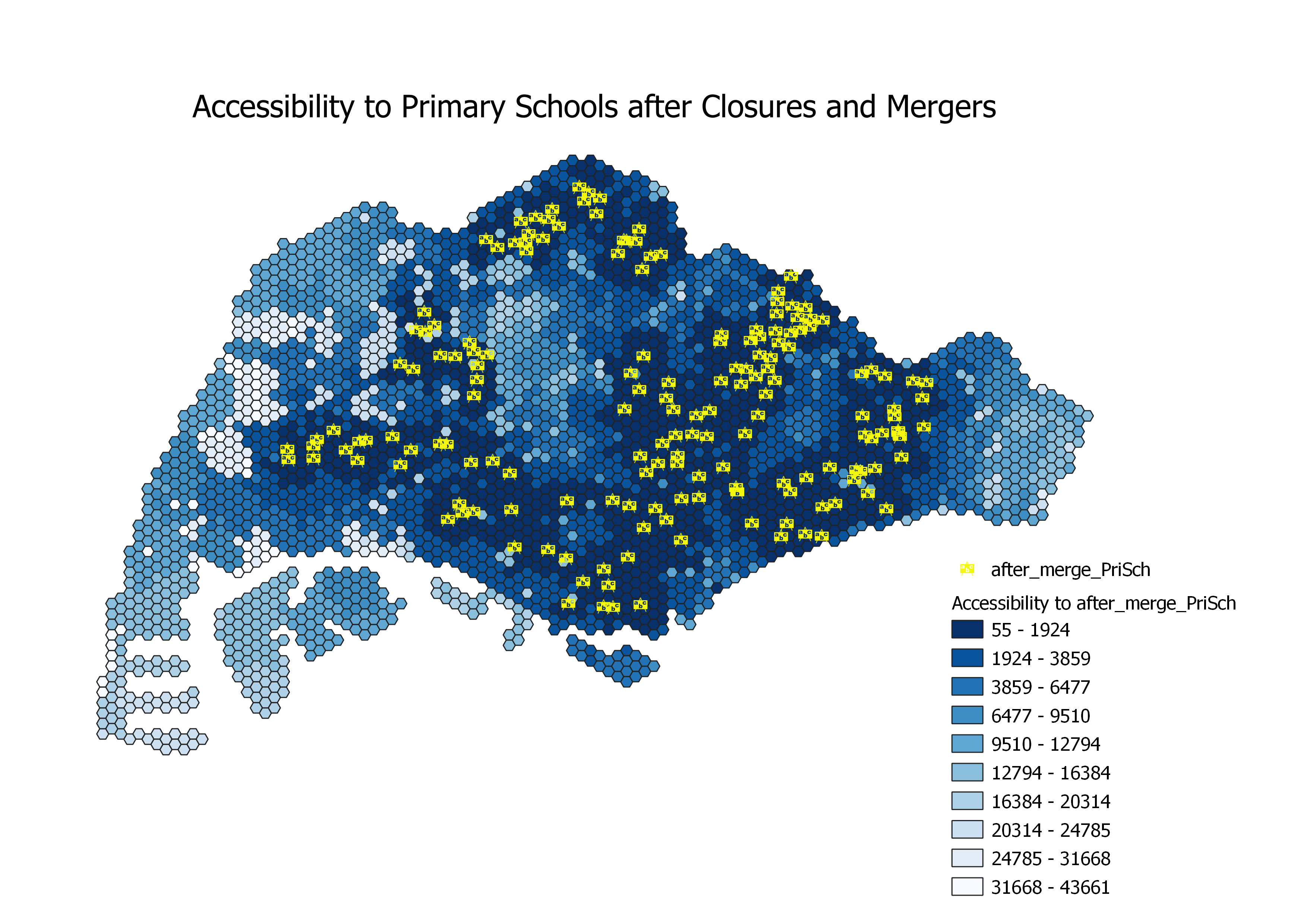 The outermost western, eastern and southern regions are still colored light blue, indicating no improvement in accessibility to primary schools. Areas with school closures and mergers (as shown in the map for before primary school mergers, where the pink symbols are) are not visibly affected as there are still existing primary schools in the near vicinity.