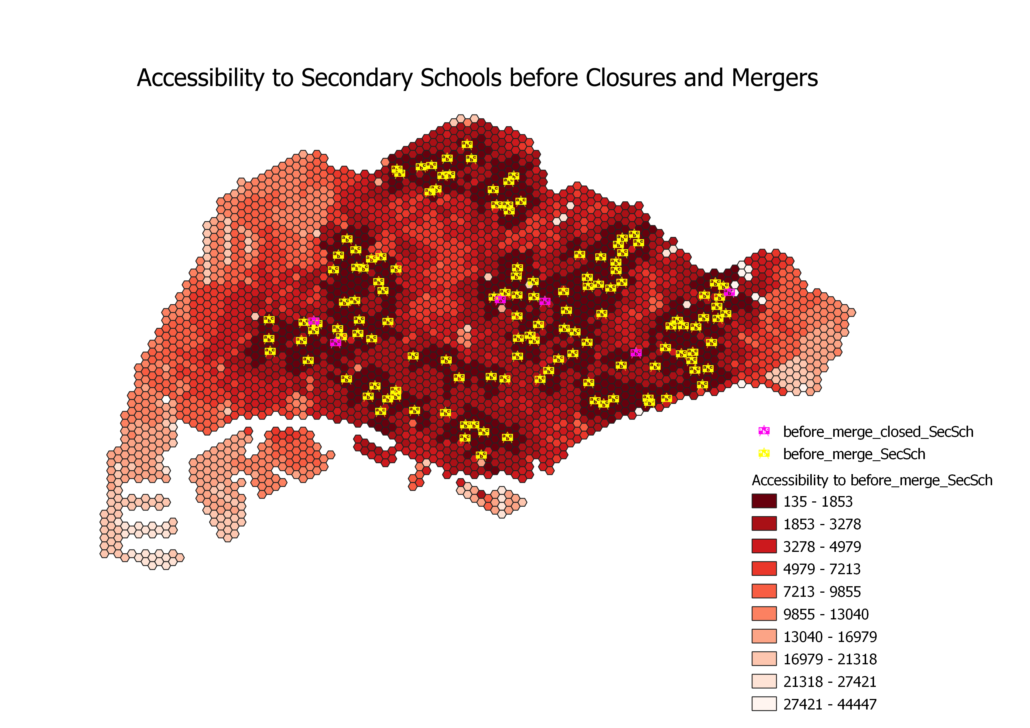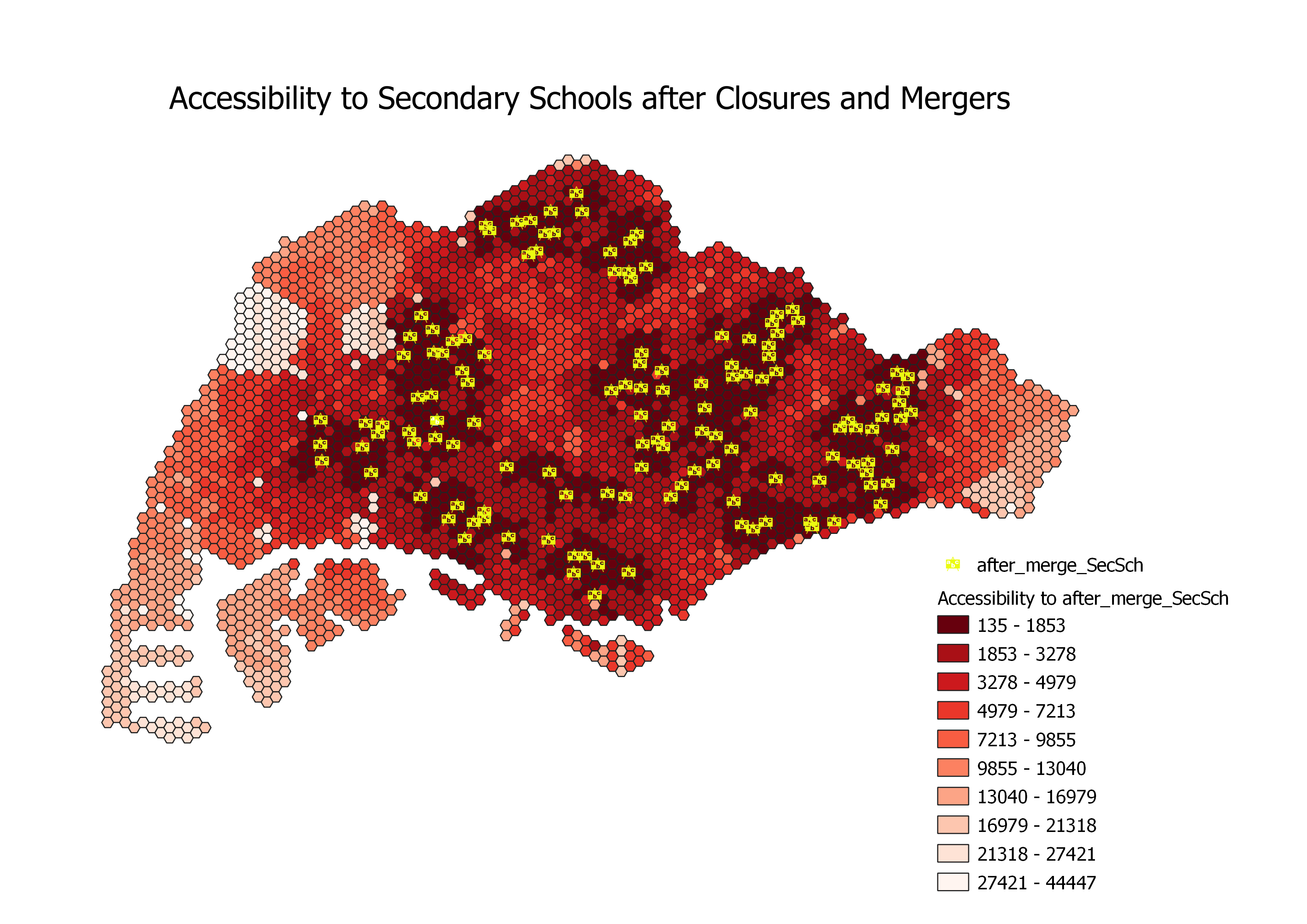 The overall accessibility to secondary schools after the school closures and mergers in 2018 and 2019 has decreased as the total area colored dark red decreased. Some regions such as the outermost western, eastern and southern regions remain relatively similar as they are still colored light red. The regions that were most impacted by the school closures and mergers are the western and central regions of Singapore. The accessibility of areas affected by the mergers is smaller compared to the accessibility of JCs as the change in shading of the hexagons were less prominent compared to their JC counterpart, from being in the darkest colour range of 135 - 1853 to the to the second darkest colour range of 1853 - 3278.