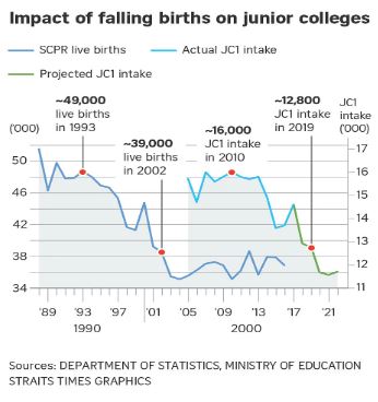 Upon further investigation, these mergers and closures can be attributed to the population of existing schools and their ability to continue operating with their current student population who are not graduating. Following that, the decreasing demand for JCs may be correlated with the declining birth rate of Singapore, as seen in the infographic below from a Straits Times Article (Davie, 2017).