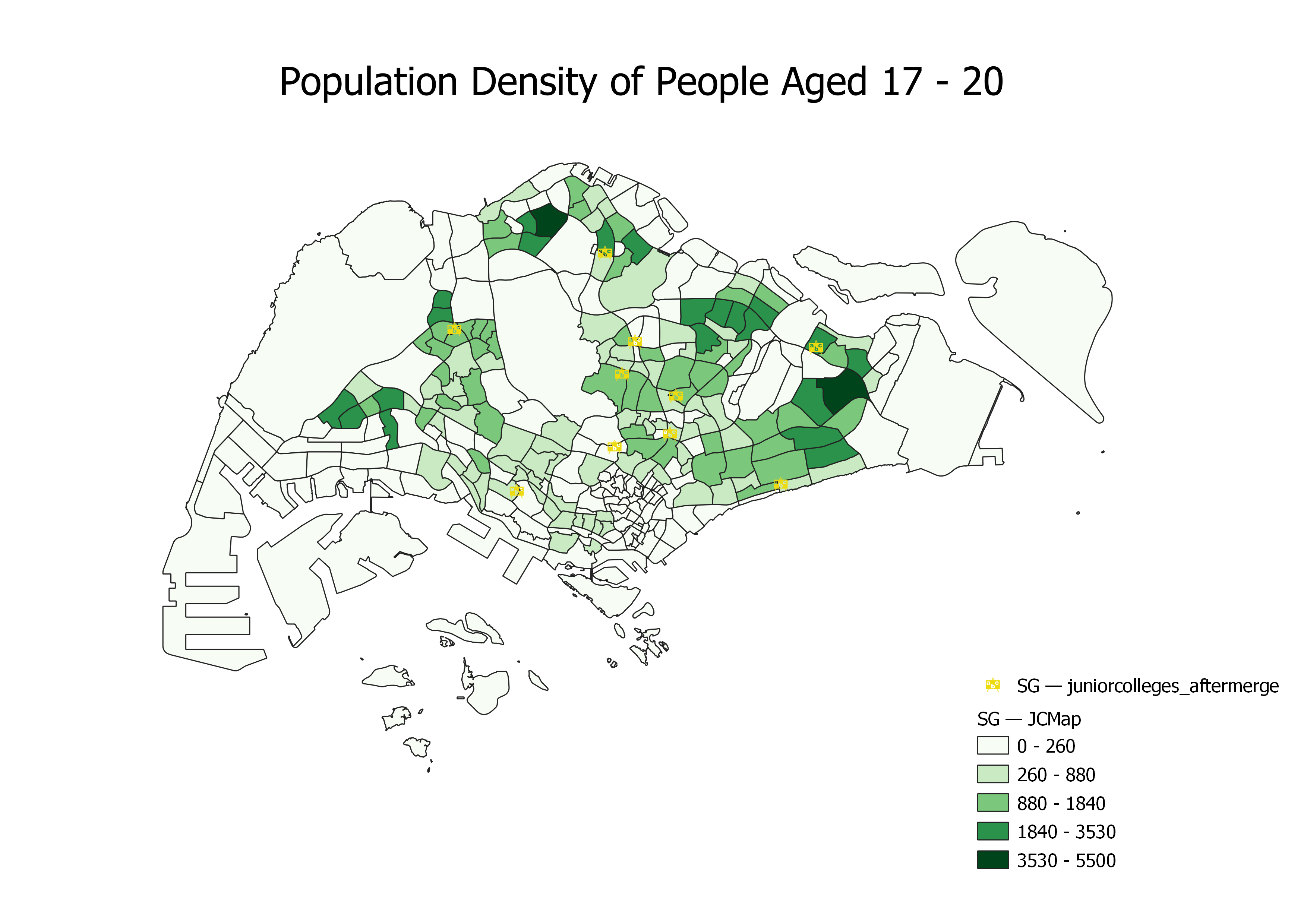 On the other hand, areas with lighter shades of green indicate lower accessibility to JCs. The outermost western, eastern and southern regions of Singapore have some of the least accessibility to JCs. However, these regions are usually not labelled as residential areas (e.g. industrial sites in Tuas, island resort in Sentosa, airport terminals in Changi Airport) which justifies having lower accessibility to JCs. Nevertheless, there are still some residential areas that are identified with lower accessibility to JCs, as seen colored with lighter shades of green as compared to those located in the central regions as mentioned in the previous paragraph. These areas include Jurong West, Choa Chu Kang and Changi.