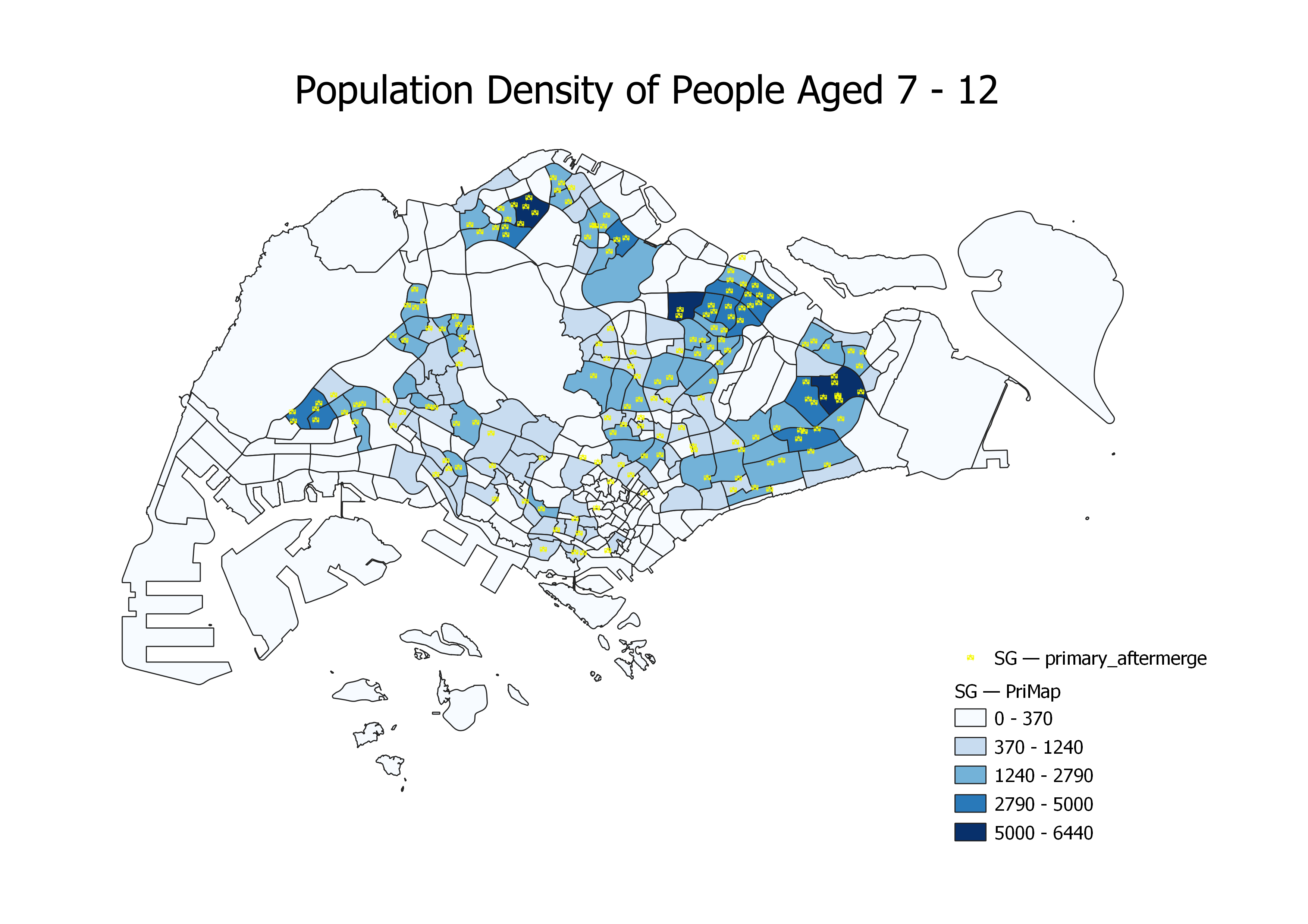 The average student age enrolling into primary schools is 7 and assuming a student successfully completes their primary education, they will be 12 years old upon graduation. Upon analysing the population aged 7-12 in 2021, more children are found to be living in the northern and eastern side of Singapore. These areas include Tampines East, Woodlands East, Fernvale.