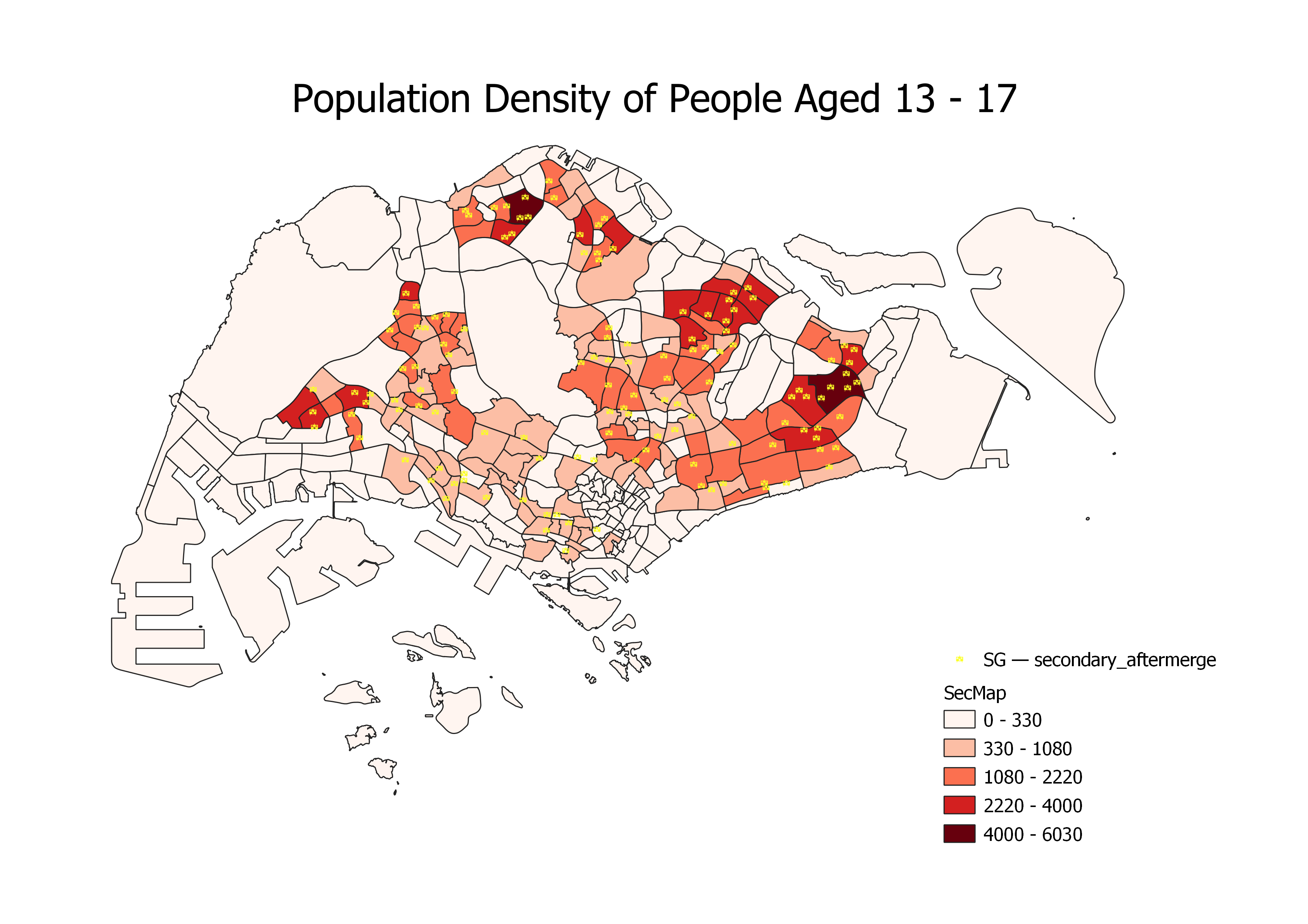 Overall, there is an adequate number of secondary schools for subzones which are more densely populated with youth aged 13 to 17. There is at least one secondary school in the subzones with the population ranges of 4000 - 6030 and 2220 - 4000. However, the number of secondary schools can be increased in certain subzone areas, especially the northeastern region of Singapore. The subzones are Fernvale, Matilda and Anchorvale. Additionally, Yunnan is a subzone with no secondary schools despite being in the second most populated range of 2220 - 4000.